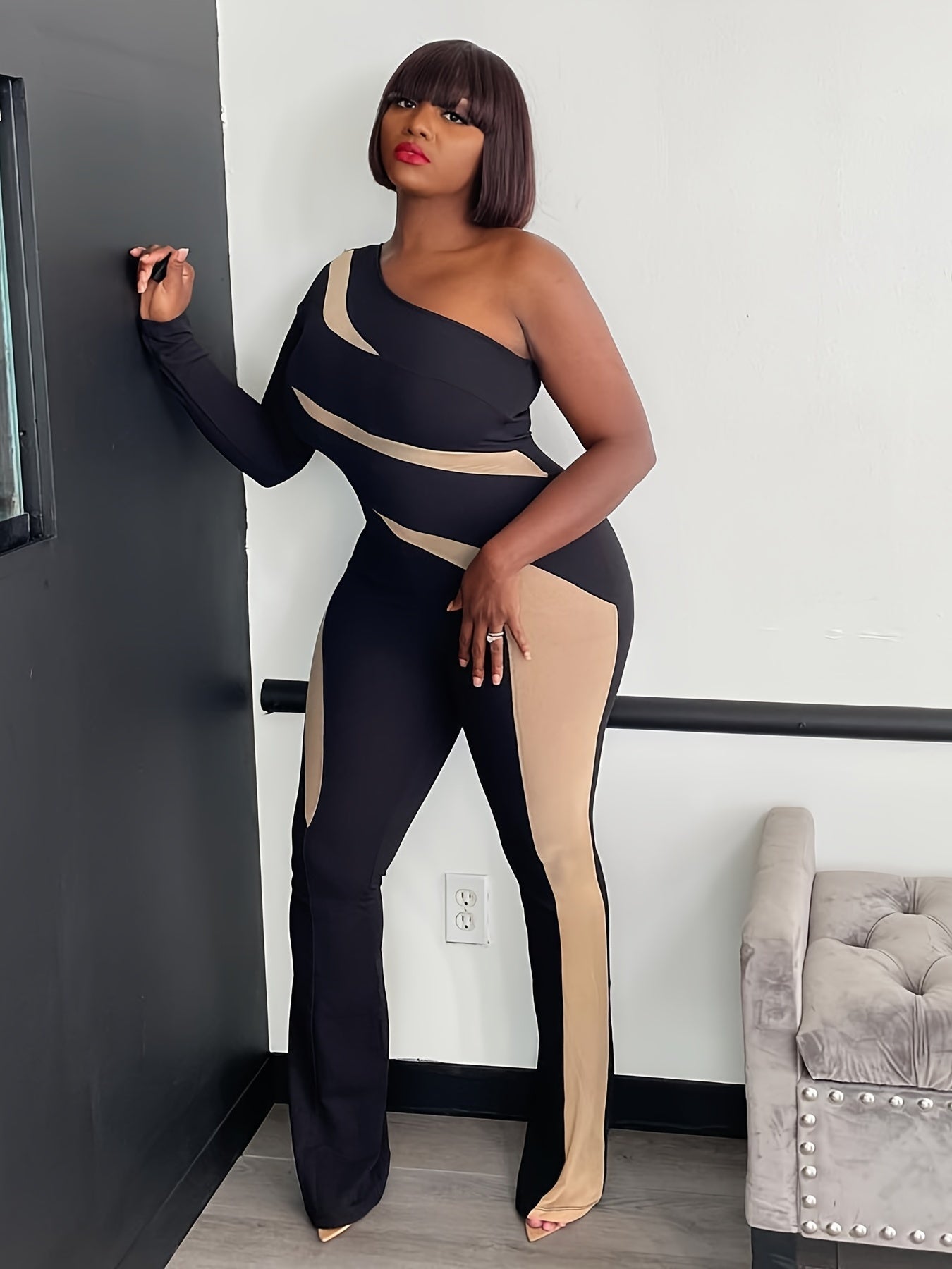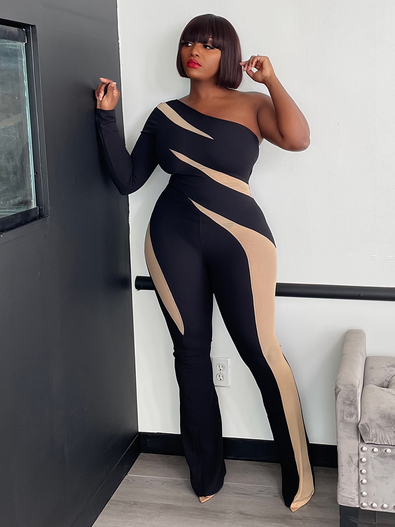 Black Black & Beige Off-Shoulder Mesh Panel Jumpsuit – Elegant Wide-Leg One-Piece Outfit