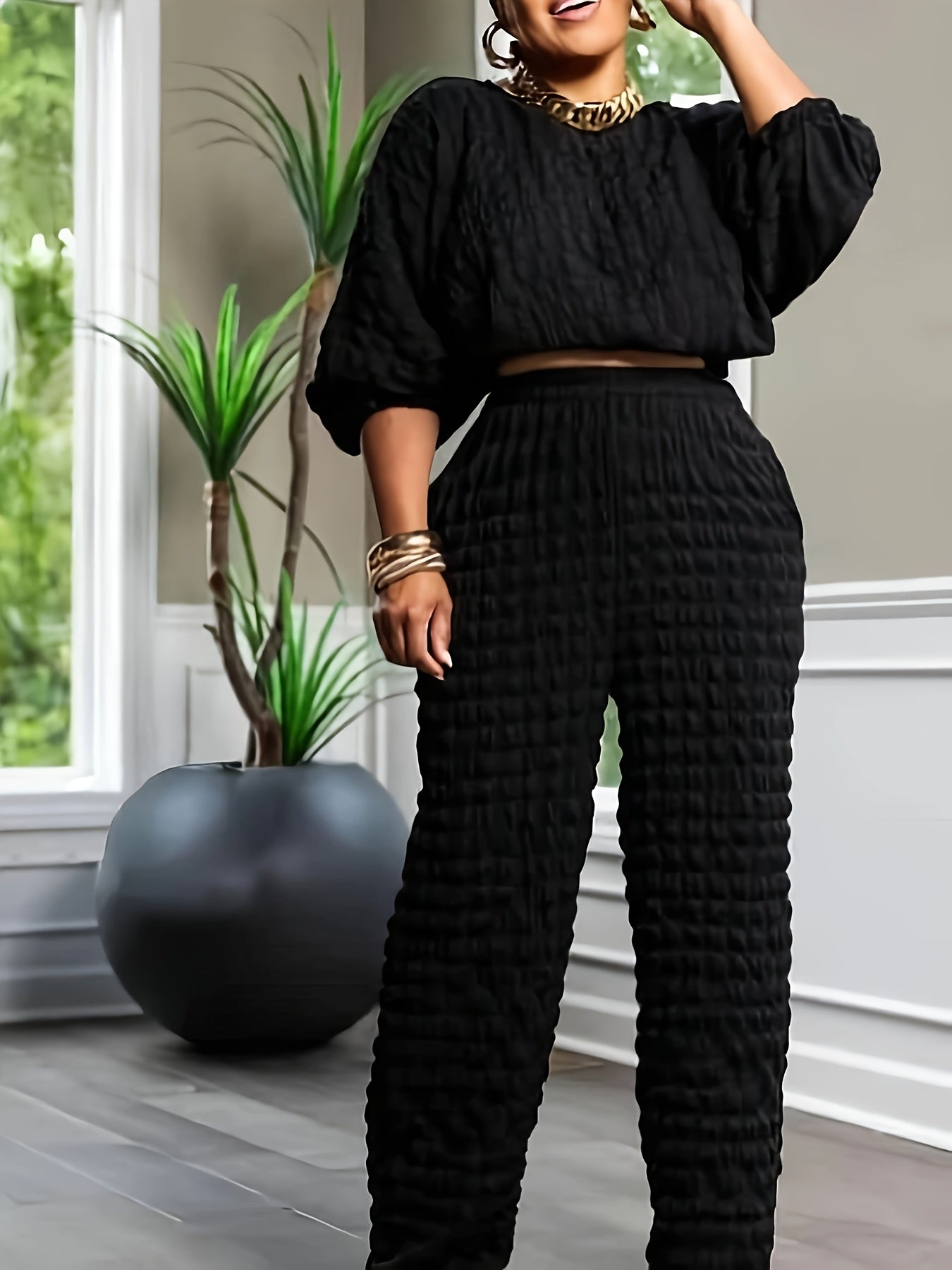 Black Comfy Bubble Cloth Two-Piece Set – Relaxed Top & Wide-Leg Pants