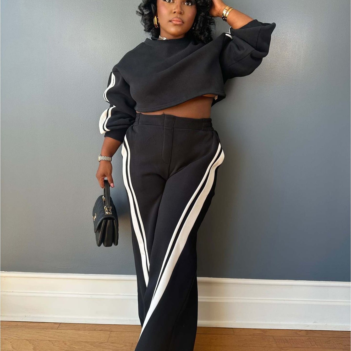Black Striped Crop Sweatshirt and Straight Pants Set