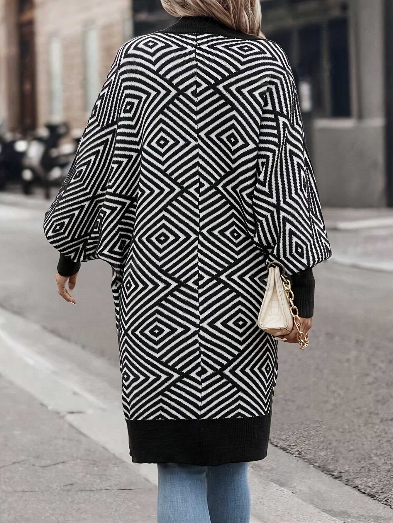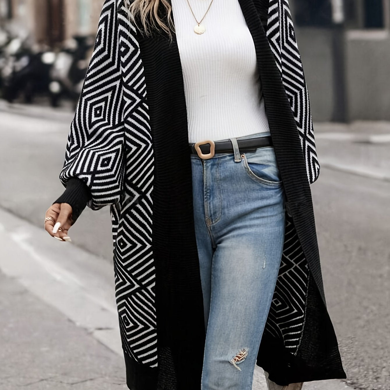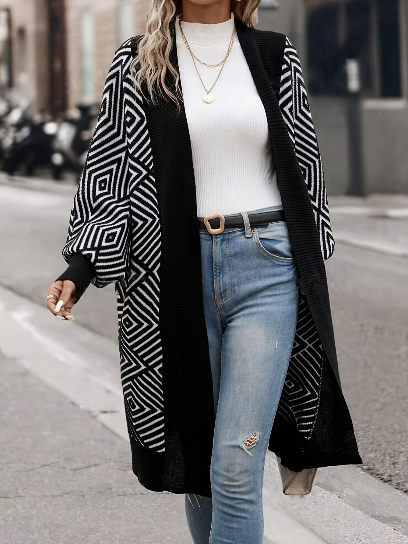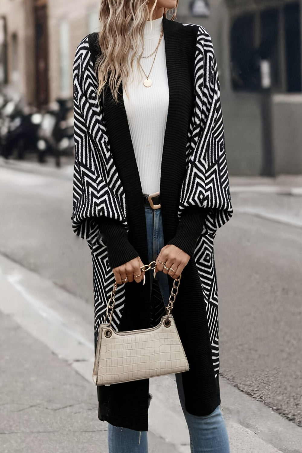 Black/White Acrylic Knit Open-Front Geometric Pattern Cardigan