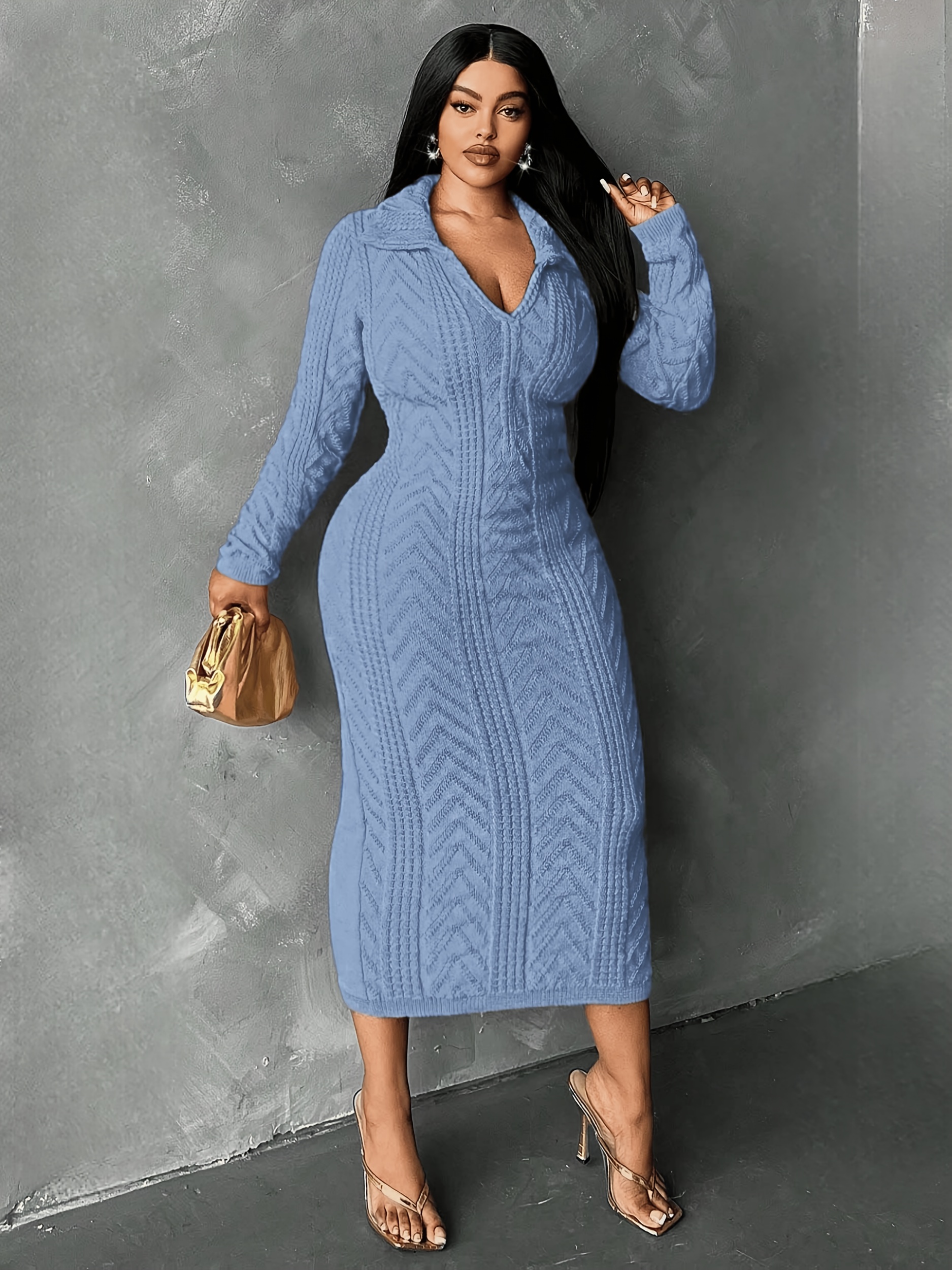 Blue Ribbed Sweater Dress – V-Neck, Collared, Long Sleeve Knit Dress for Women