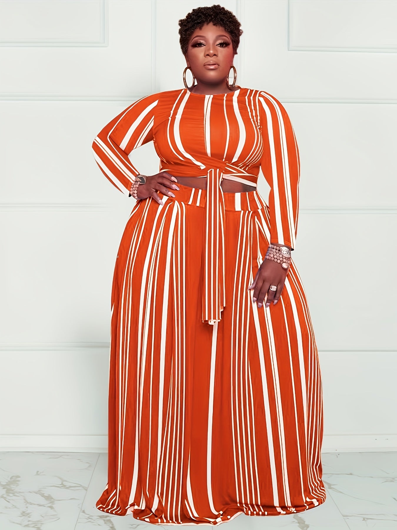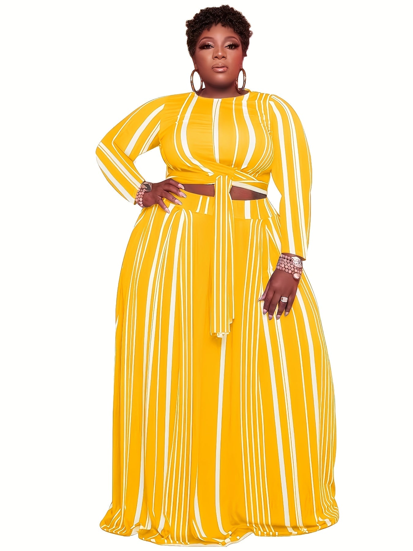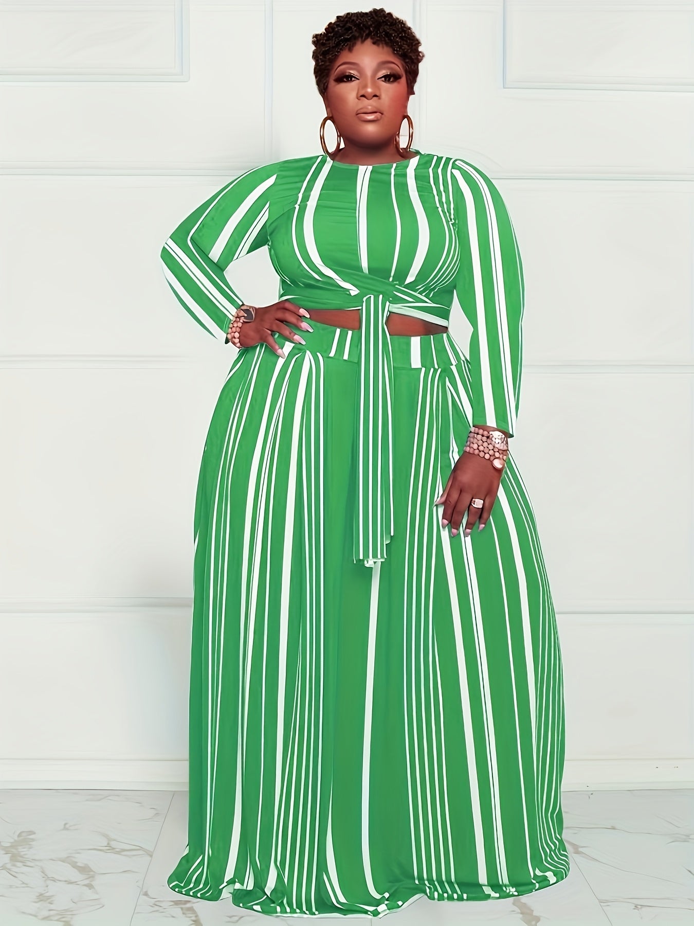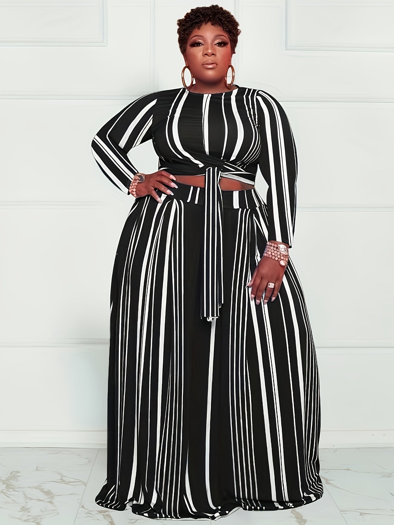 Bold Vertical Striped Crew Neck Crop Top & Wide-Leg Maxi Skirt with Belt