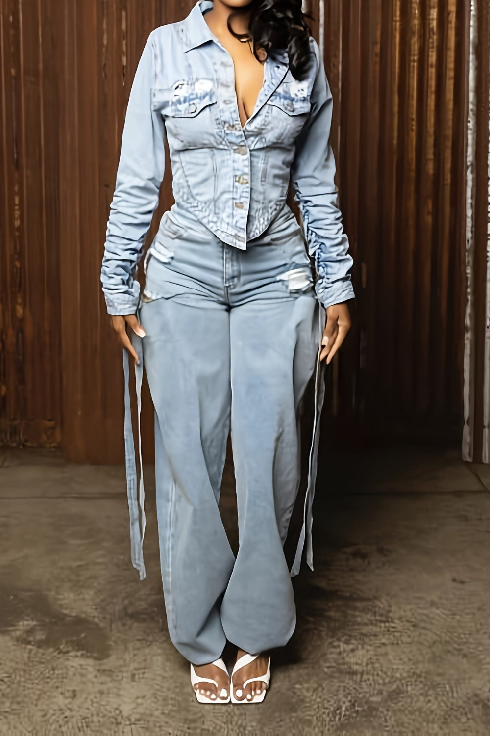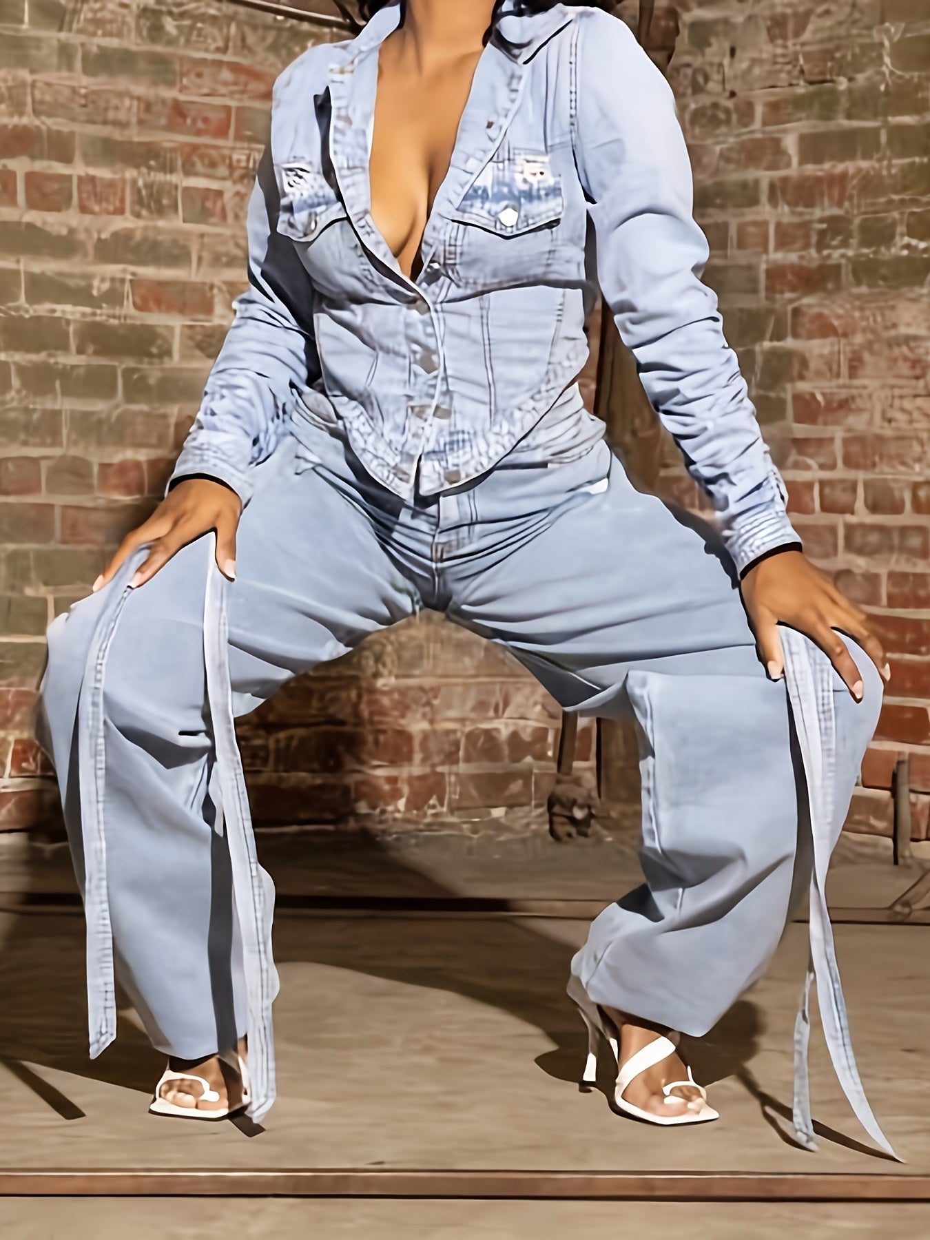 Cropped Denim Jacket with Tied Wrists & Wide-Leg Ripped Jeans Set – 2-Piece Streetwear Outfit