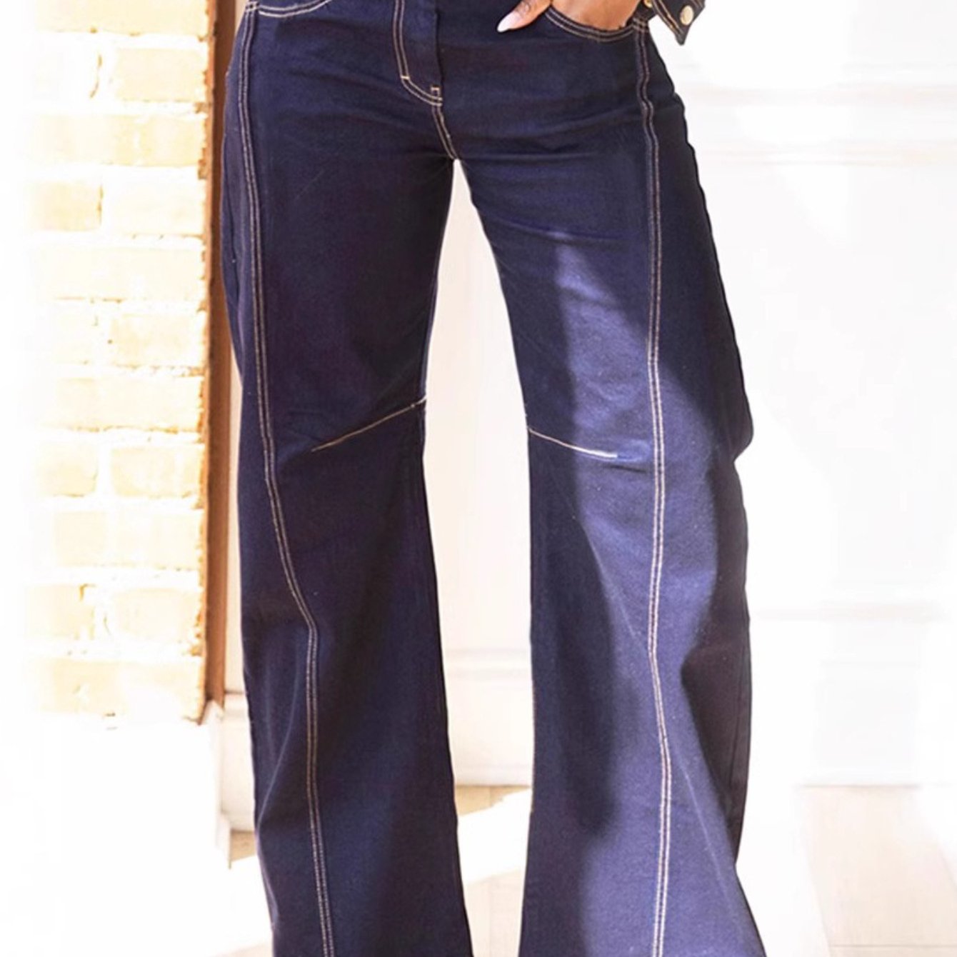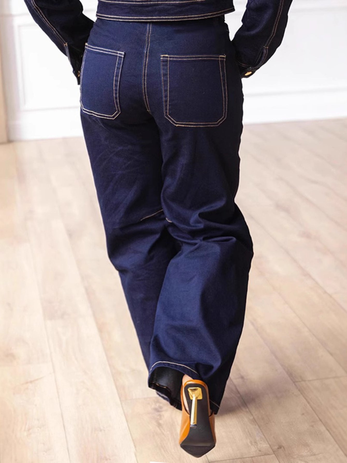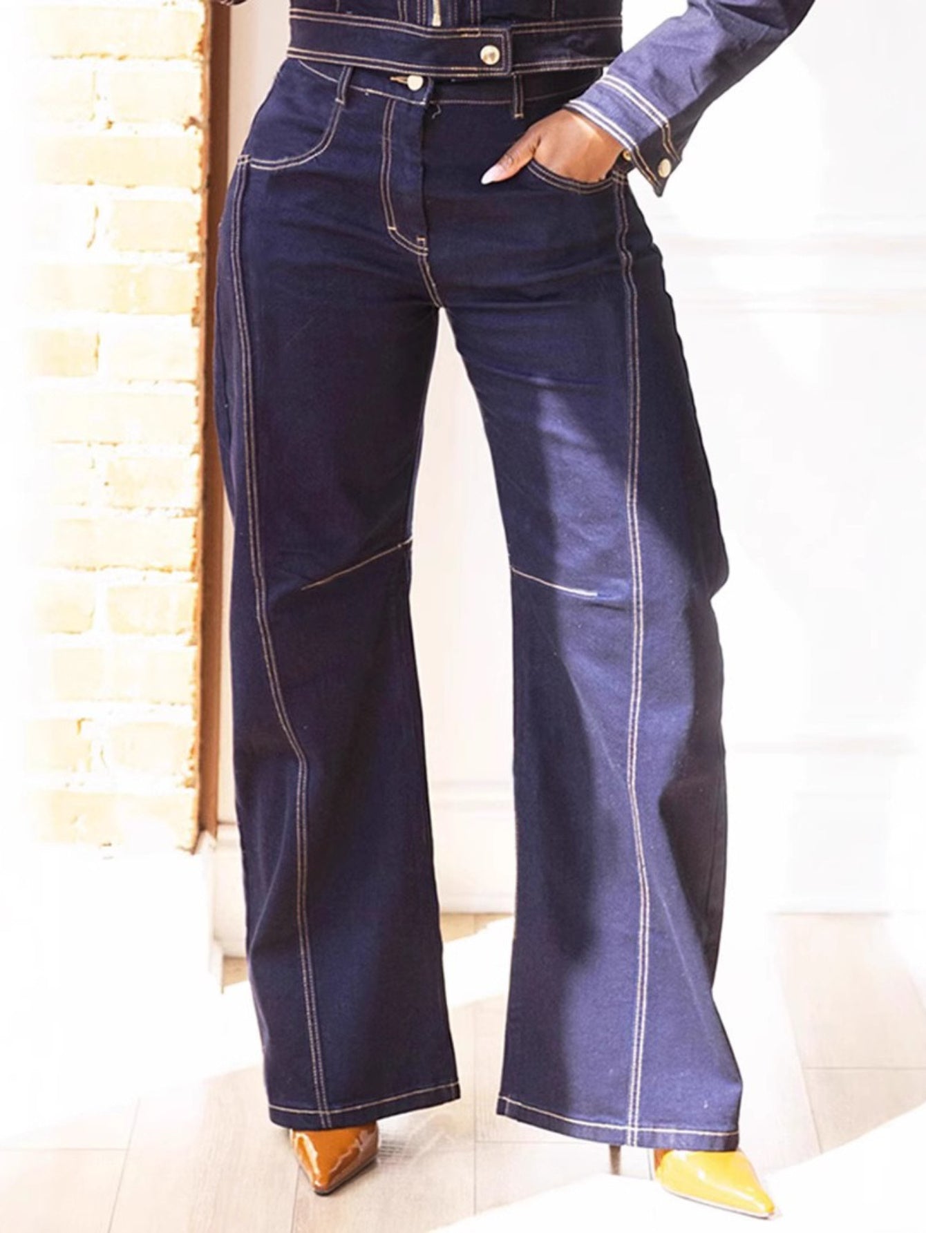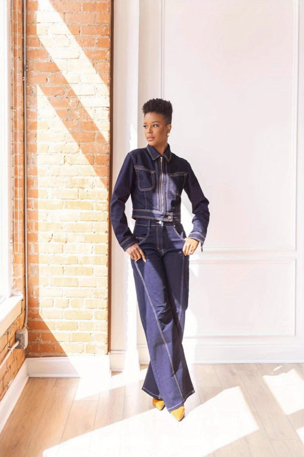 Denim Zipper Front Jacket and Stitched Wide-Leg Jean Set