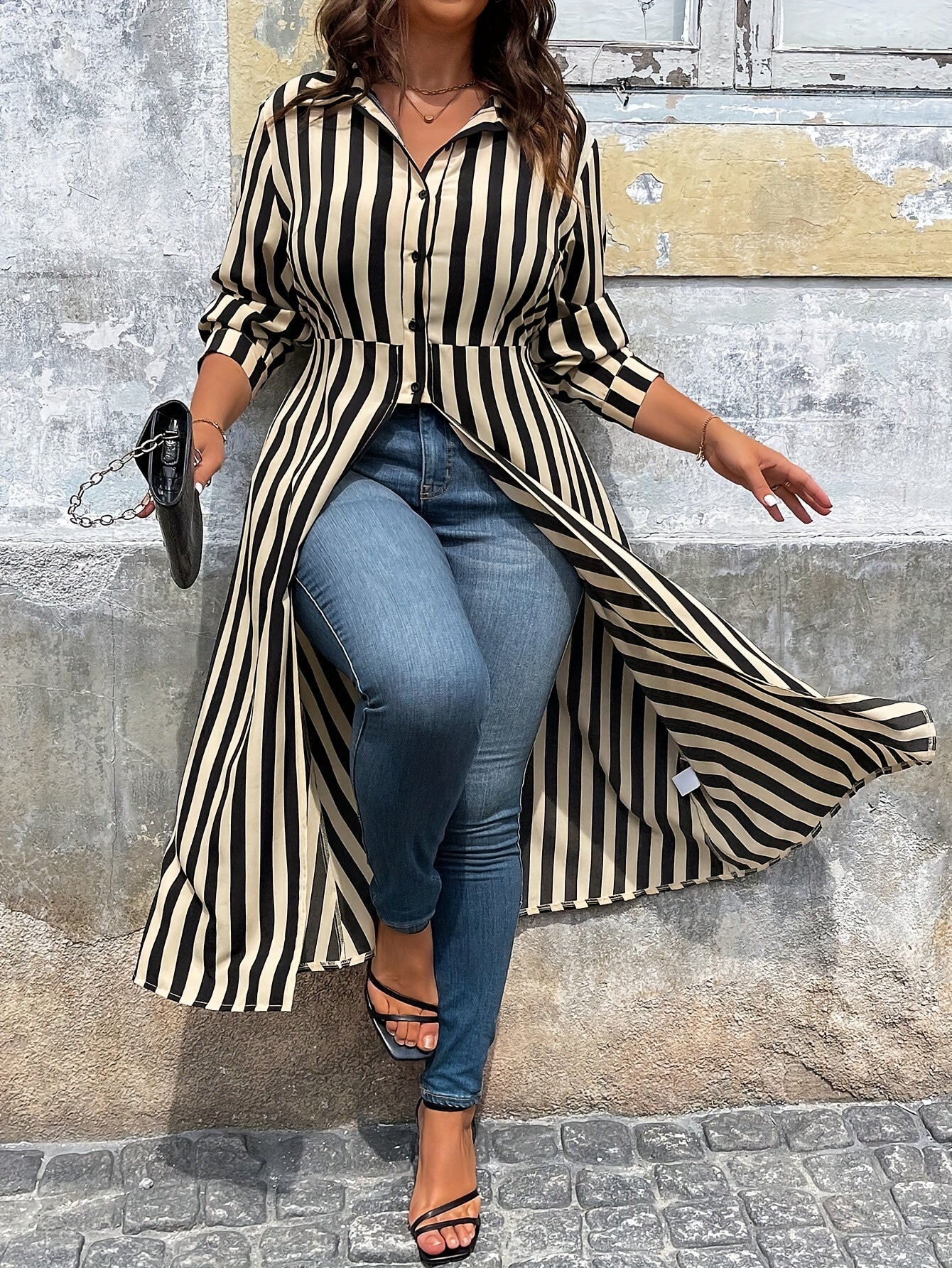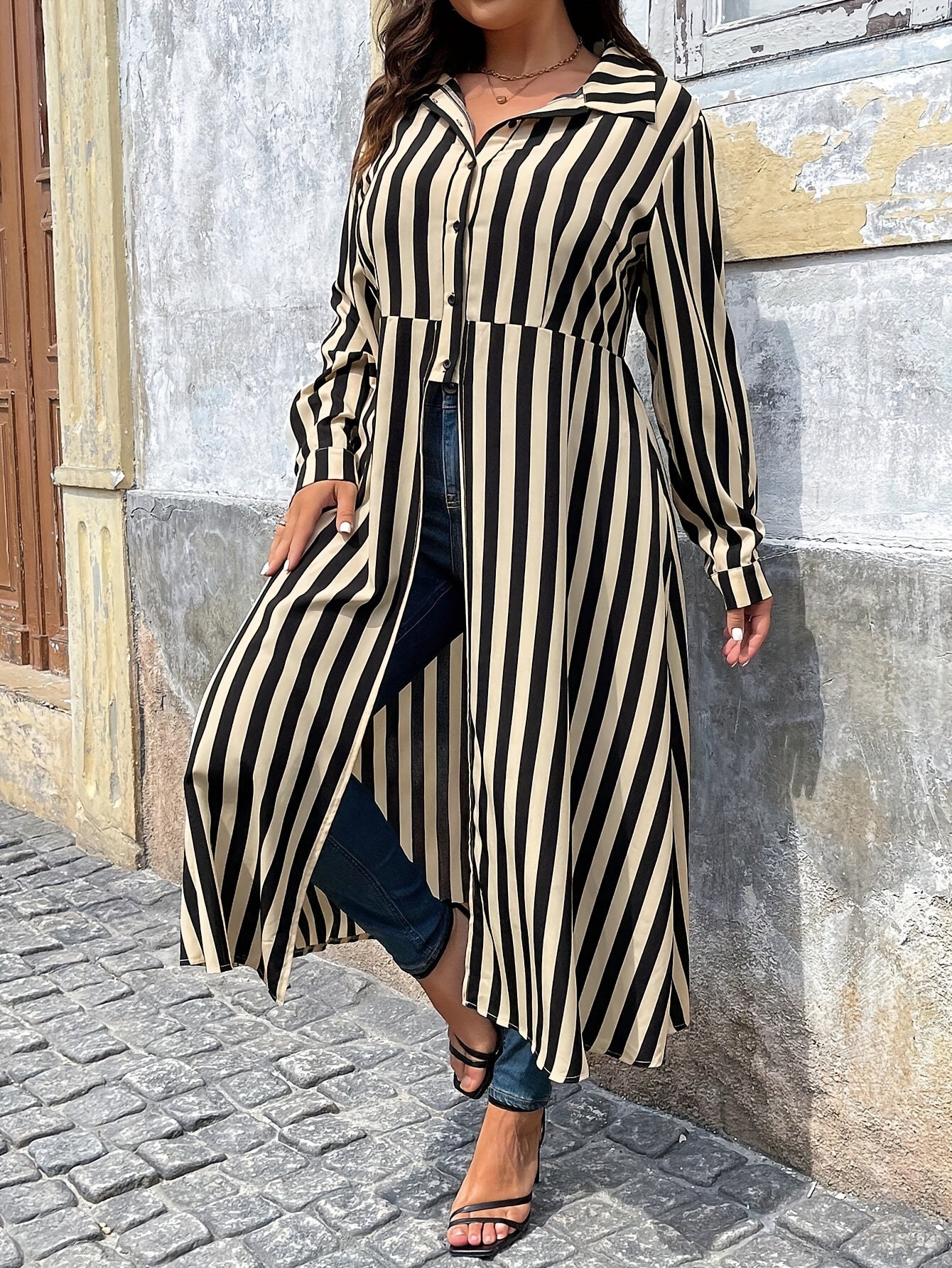 Collared Striped Button-Up Hi-Lo Blouse with Front Split