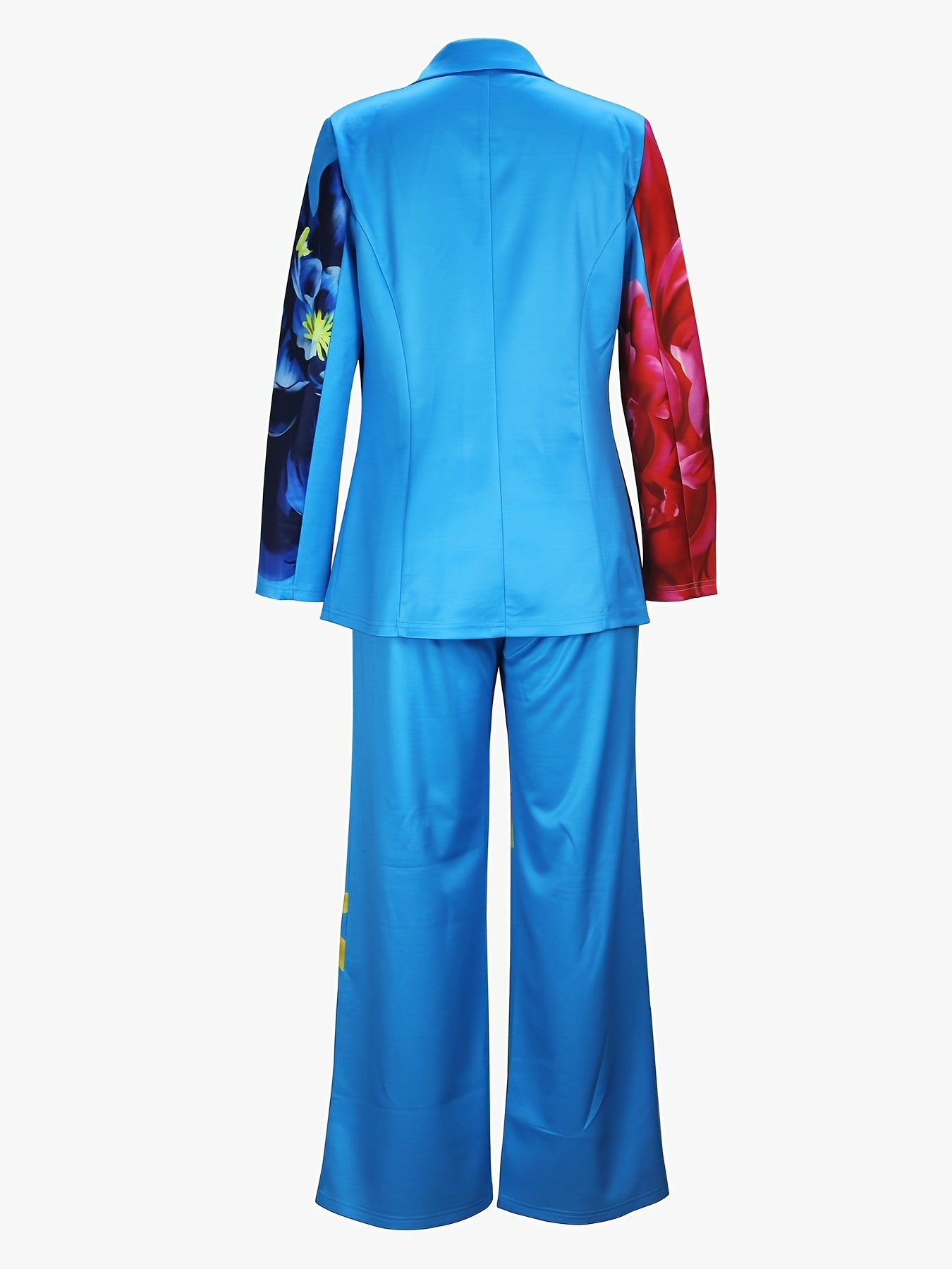 Floral Print V-Neck Blazer and Flare Trouser Pants Set