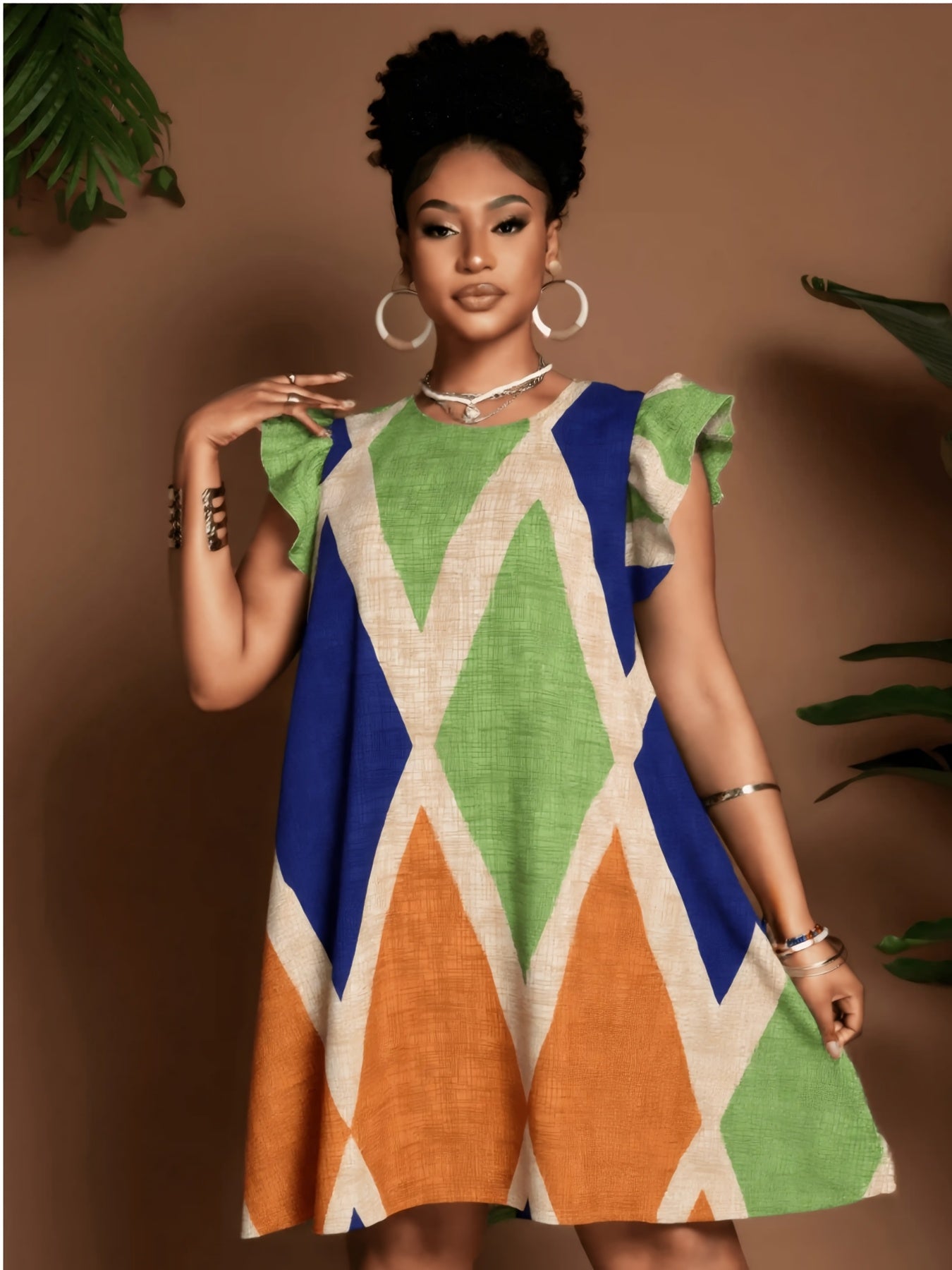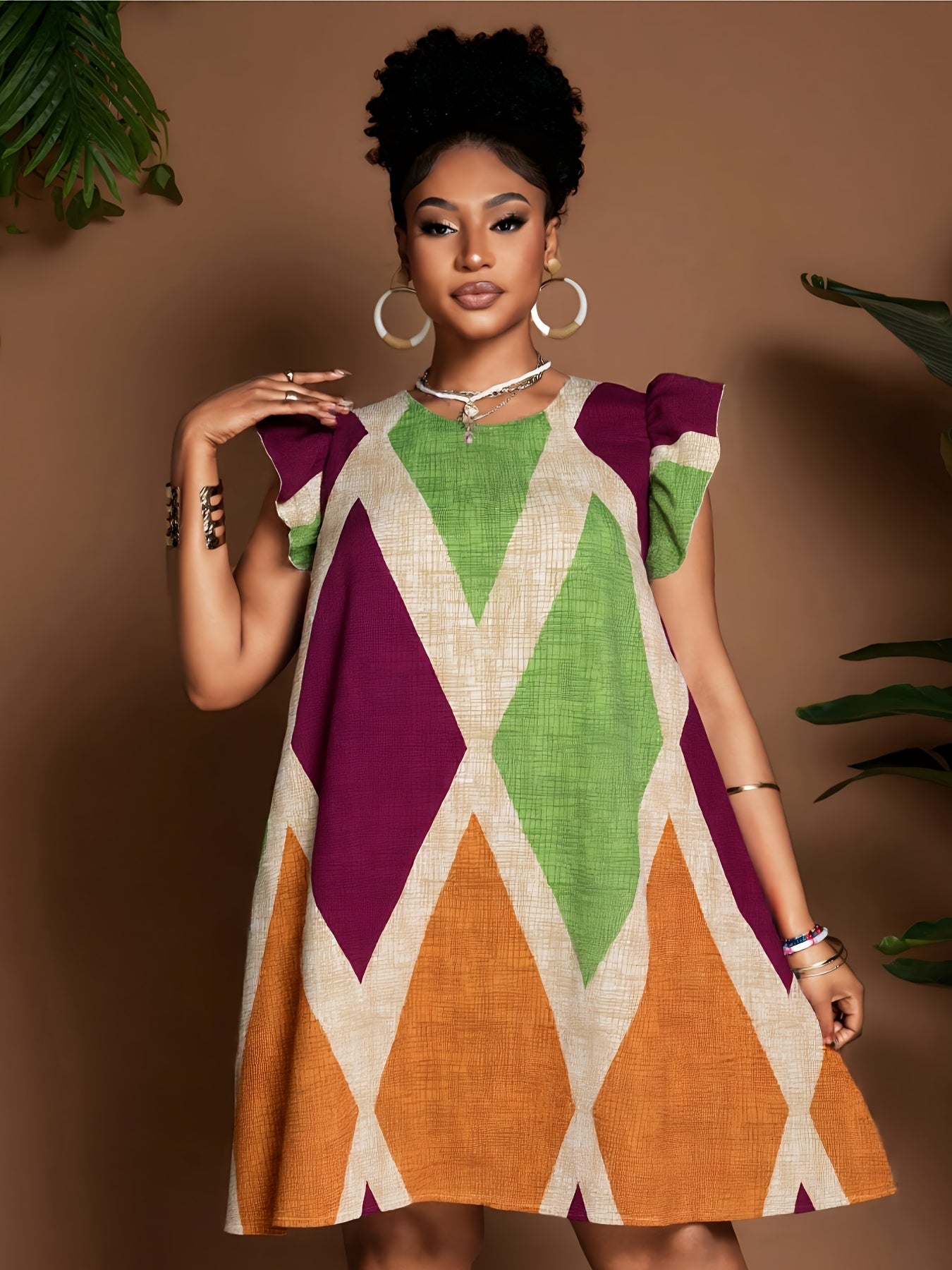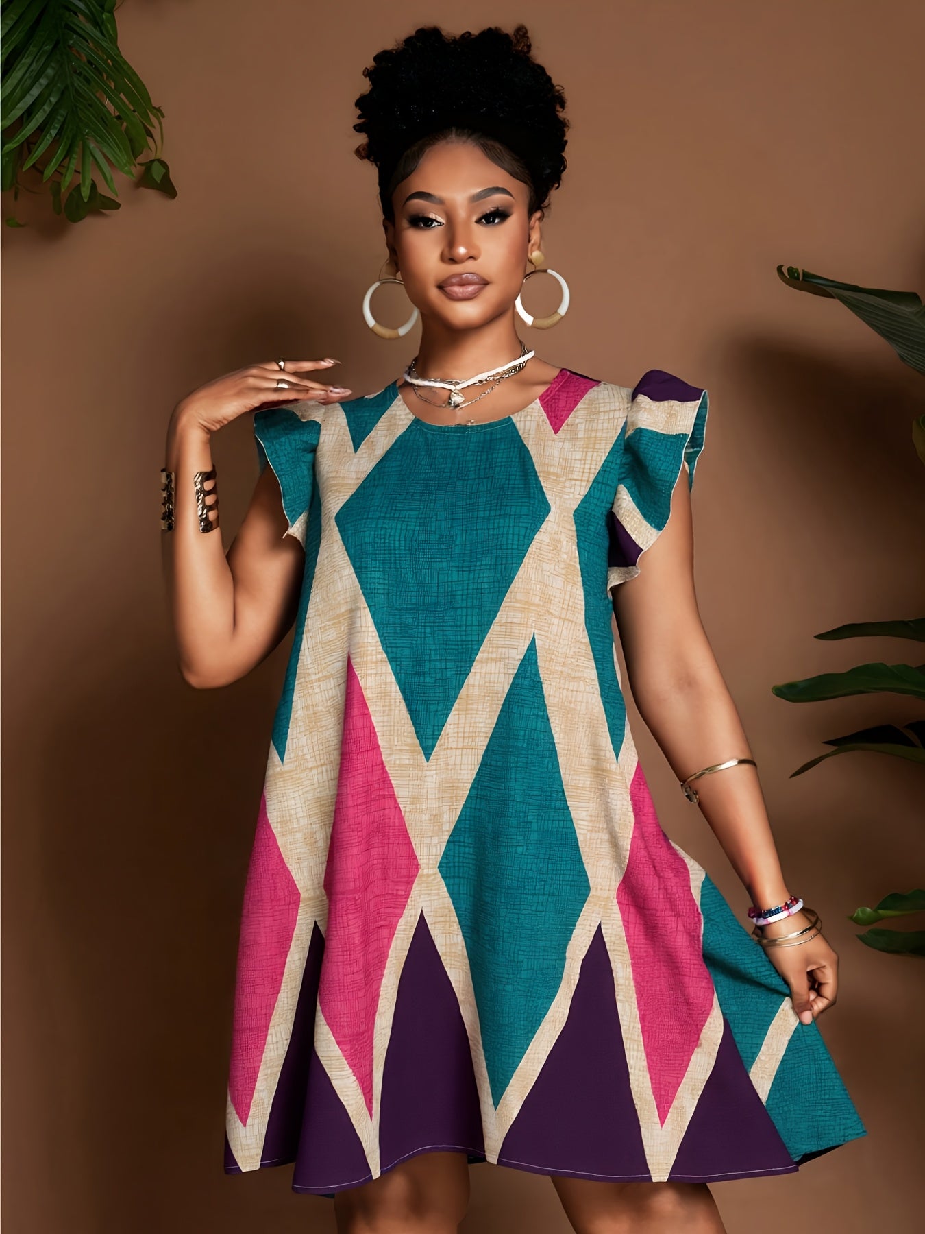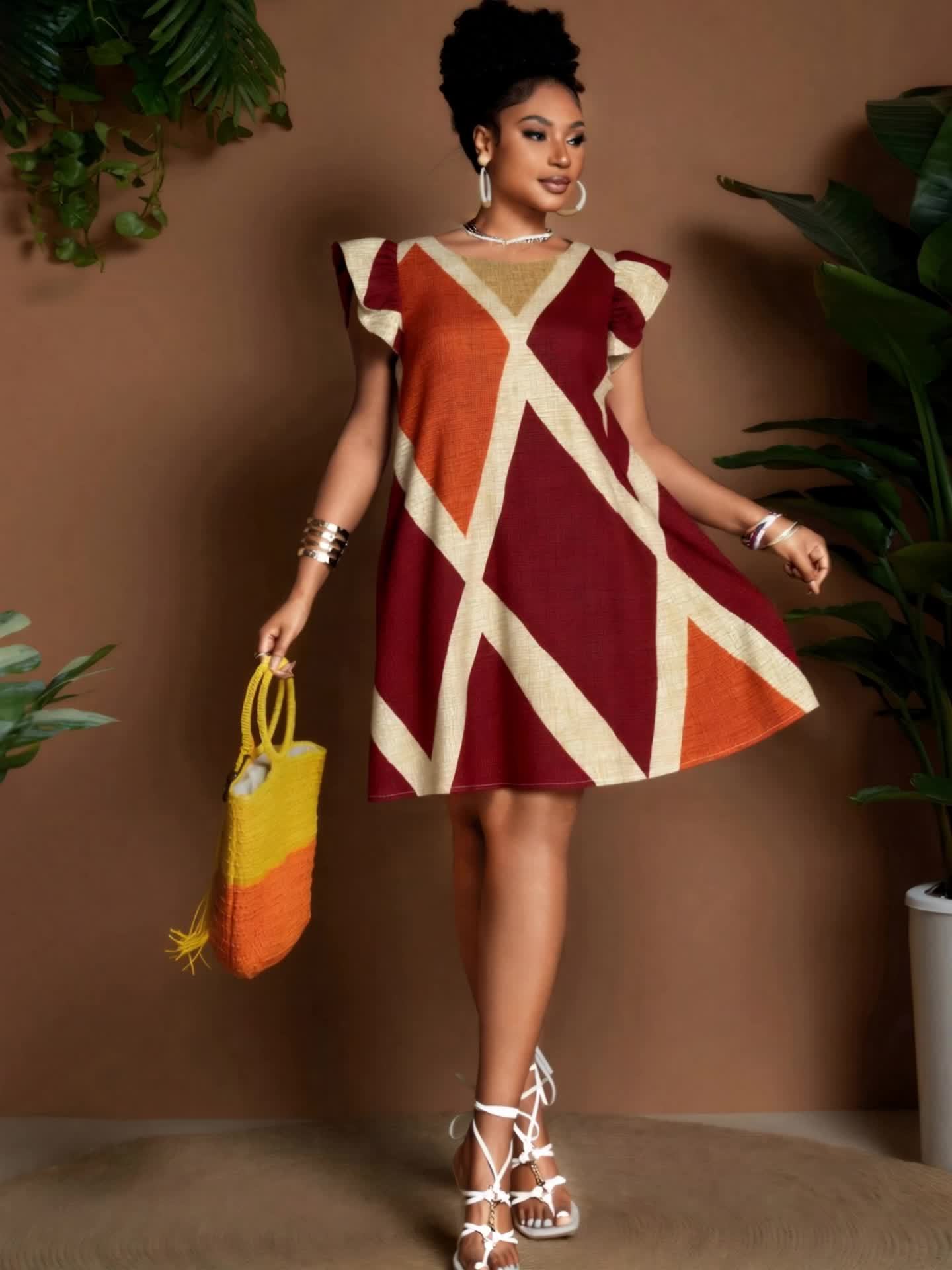 Geometric Ruffle Sleeve A-Line Mini Dress – Bold, Flowy & Flirty