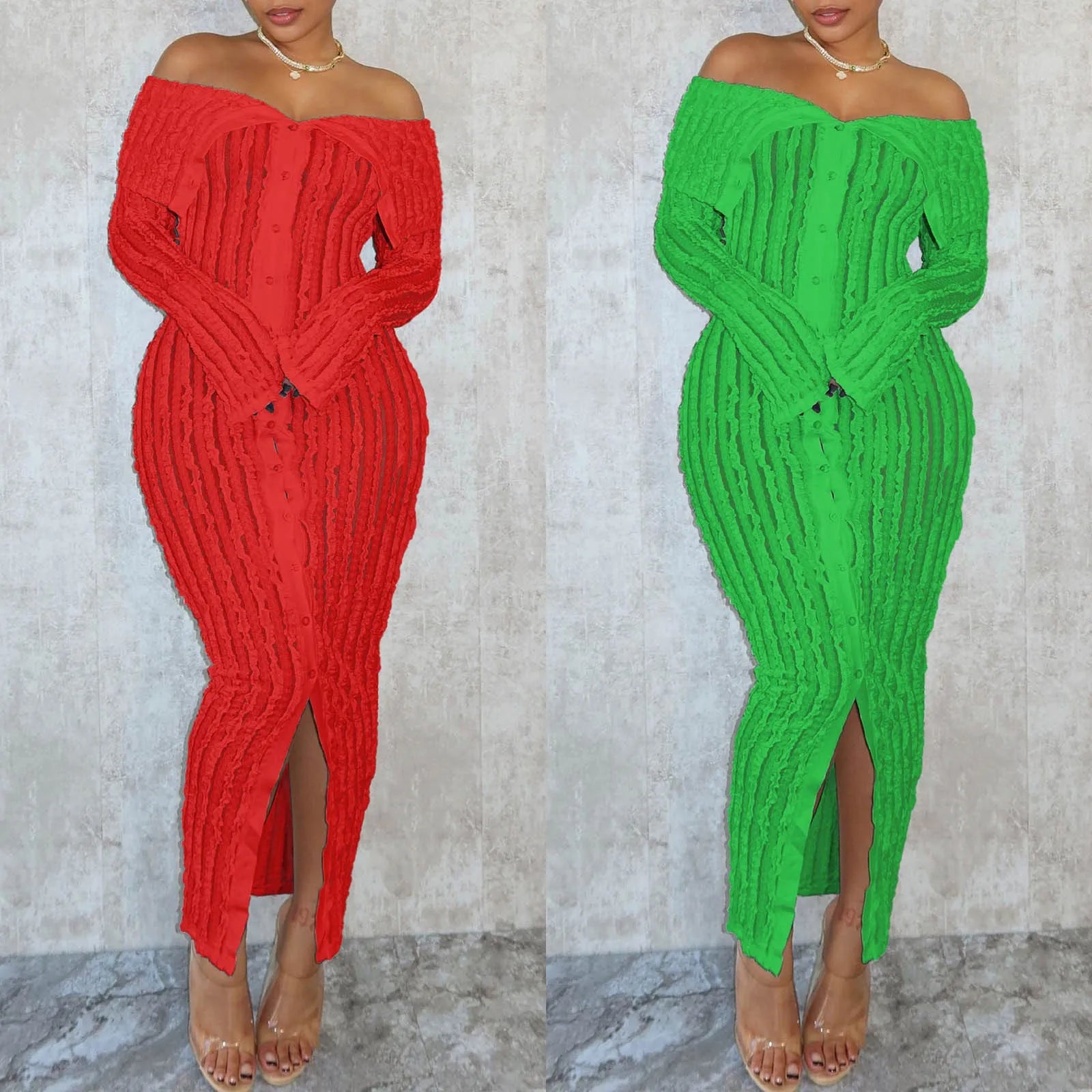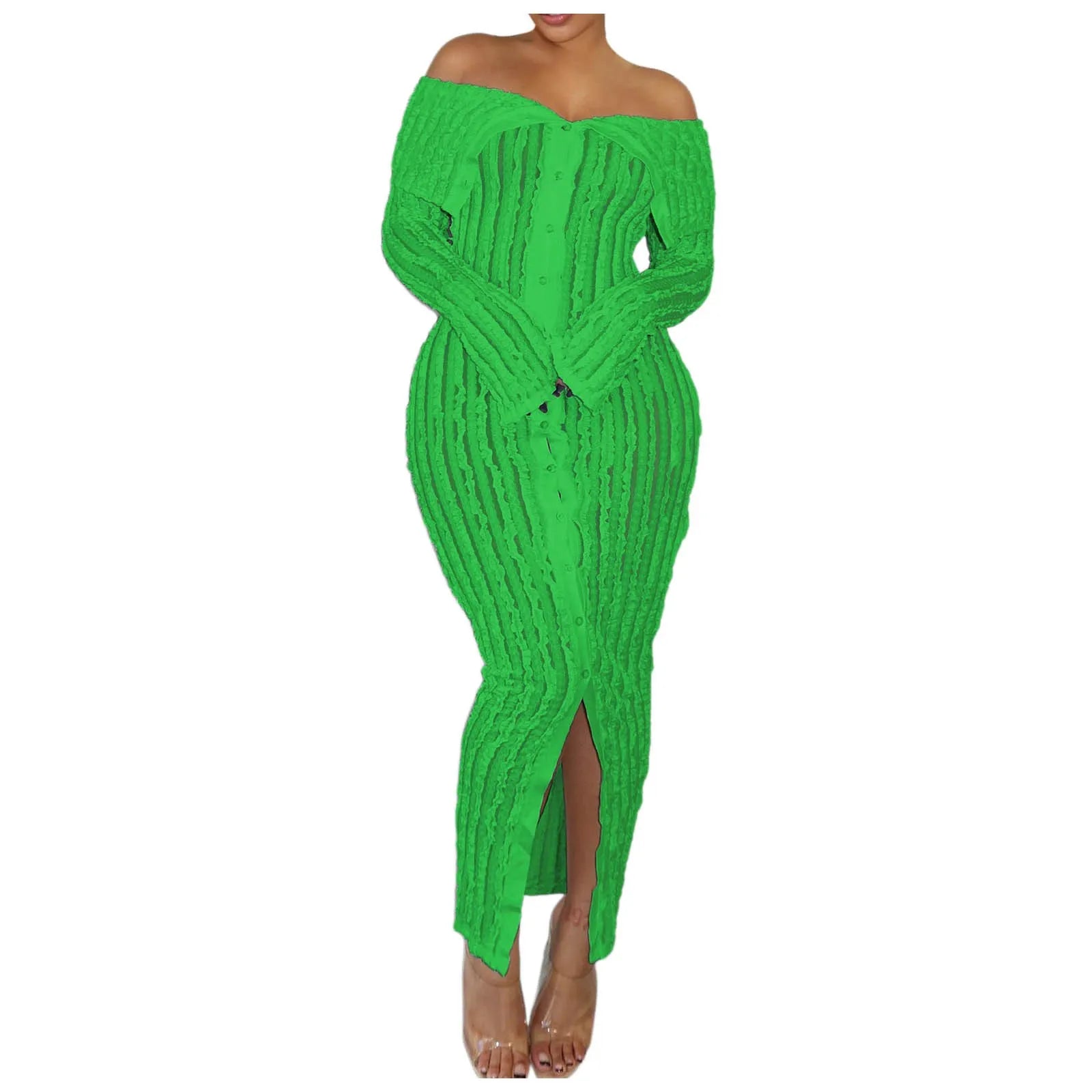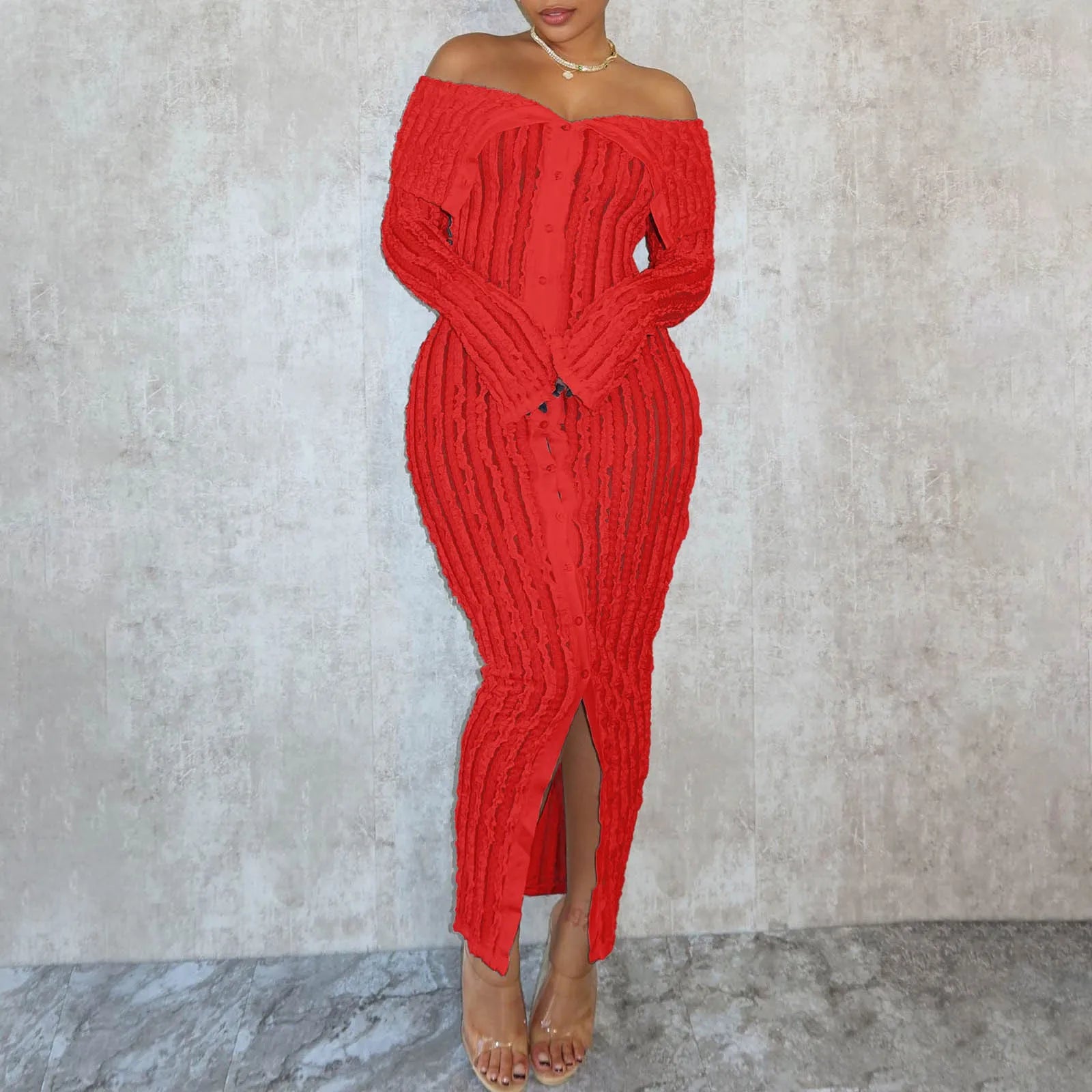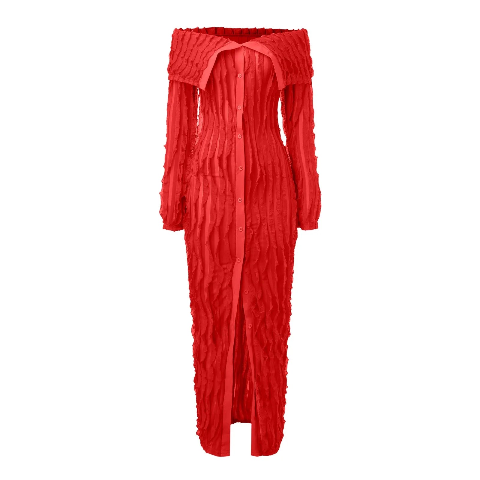 Elegant Off-Shoulder Maxi Dress – Long Sleeve Button-Down Holiday Outfit