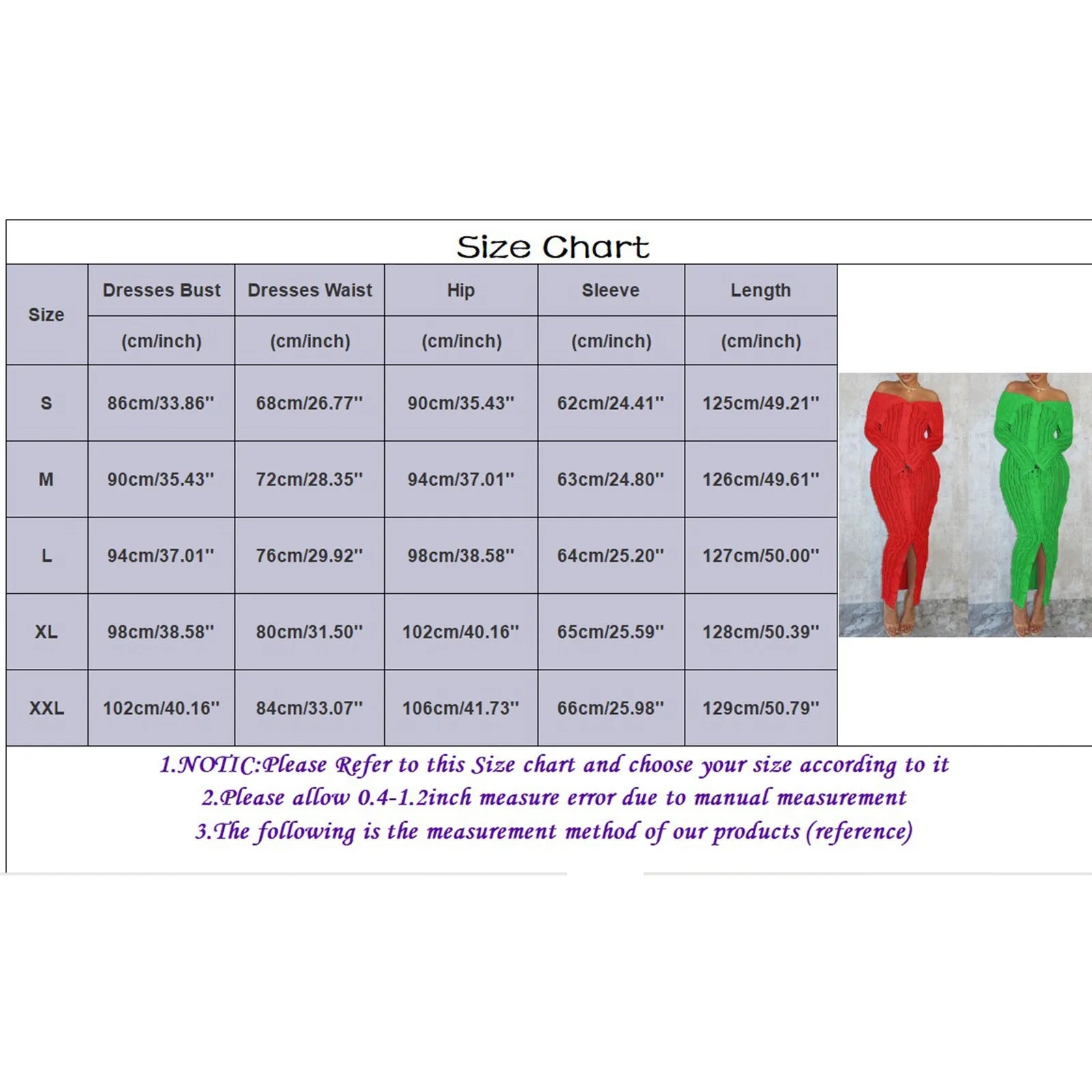 | Size:XL | Dresses Bust:98cm/38.58'' | Dresses Waist:80cm/31.50'' | Hip:102cm/40.16'' | Sleeve:65cm/25.59'' | Length:128cm/50.39'' |