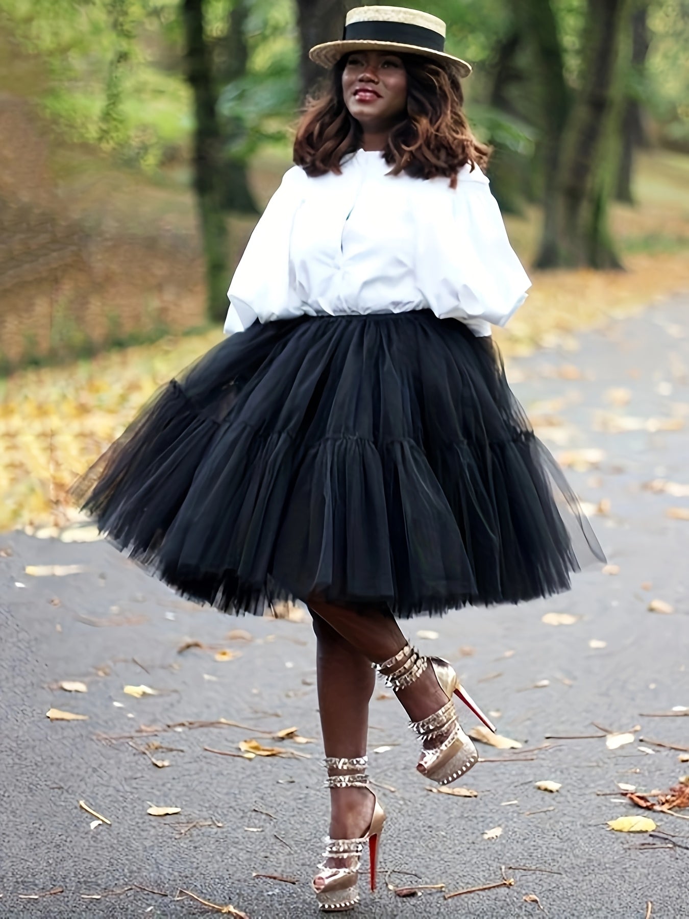 - Details: Layered Mesh Overlay, Flowing Flared Hem,