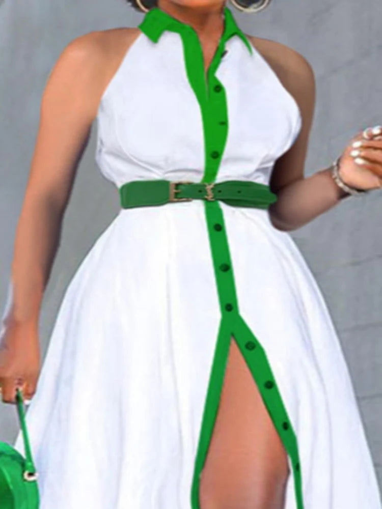 White & Green Sleeveless Buttoned Dress