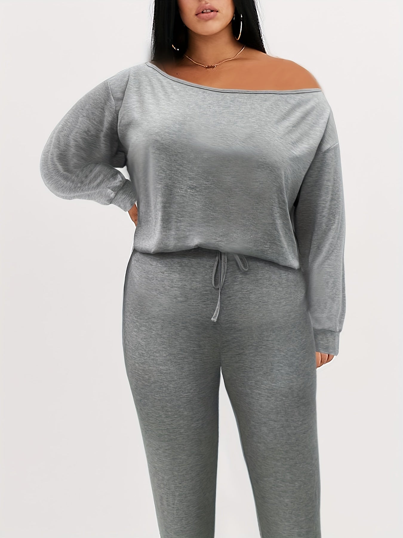Plus Size Two-Piece Set – Solid Color Cross-Shoulder Collar Long Sleeve Top & Pants – Casual Chic Outfit