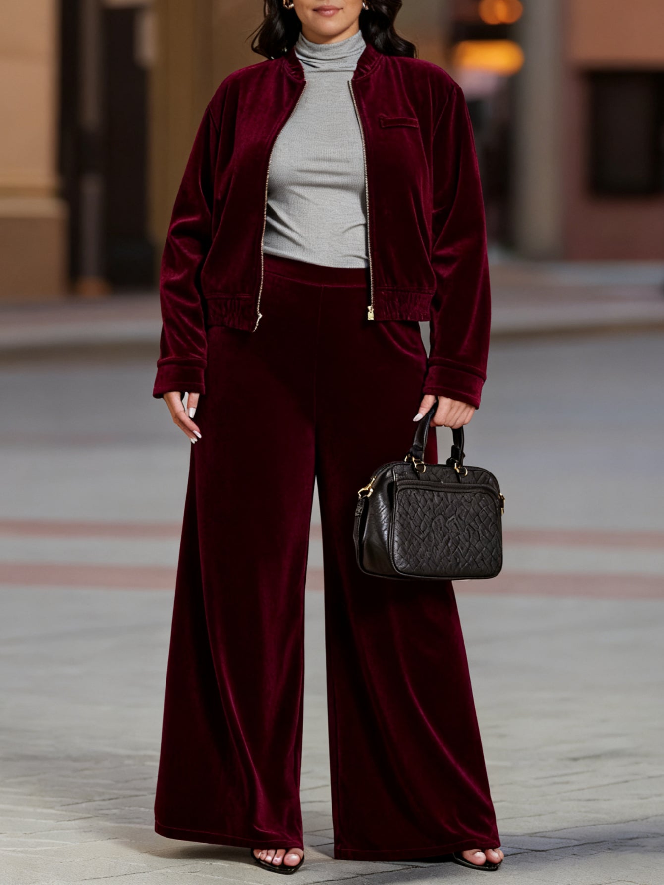 Retro Style Crimson Short Jacket & Wide-Leg Pant Set