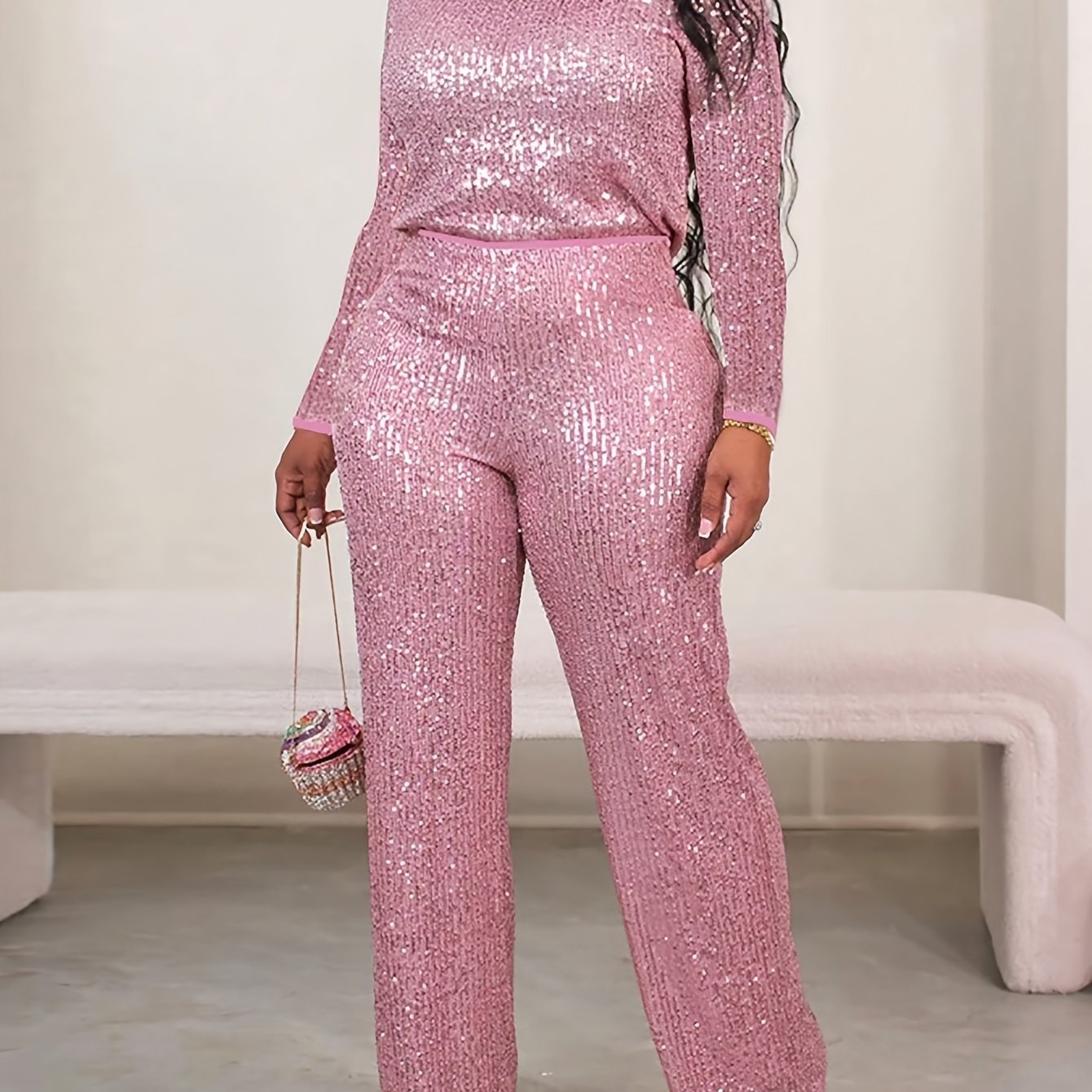 Sequin Crew Neck Top & Wide-Leg Pants Set – Elegant Party & Evening Outfit
