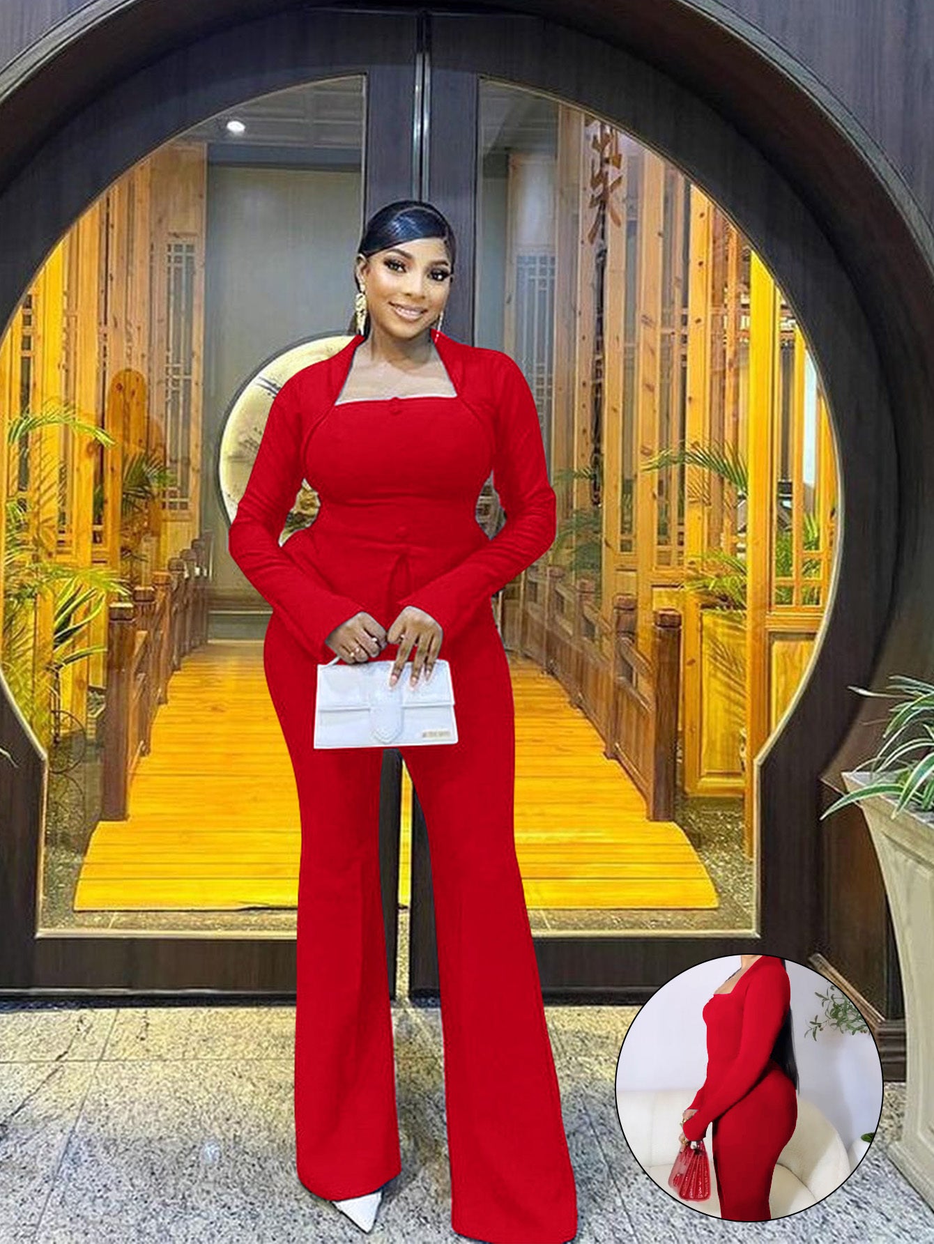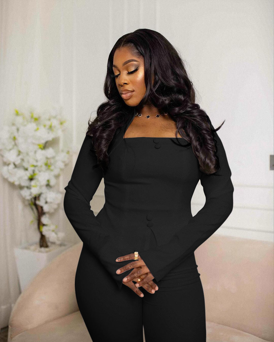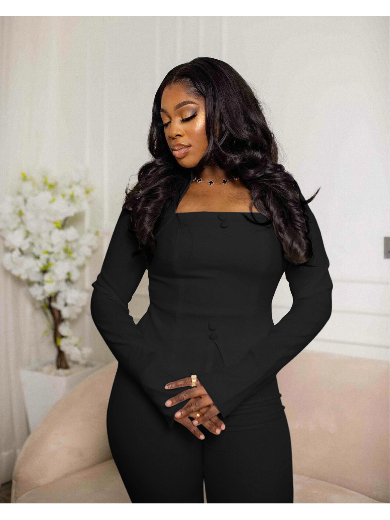 Squared Neck Button Detail Split-Front Top with Flare Pants – Chic Two-Piece Outfit