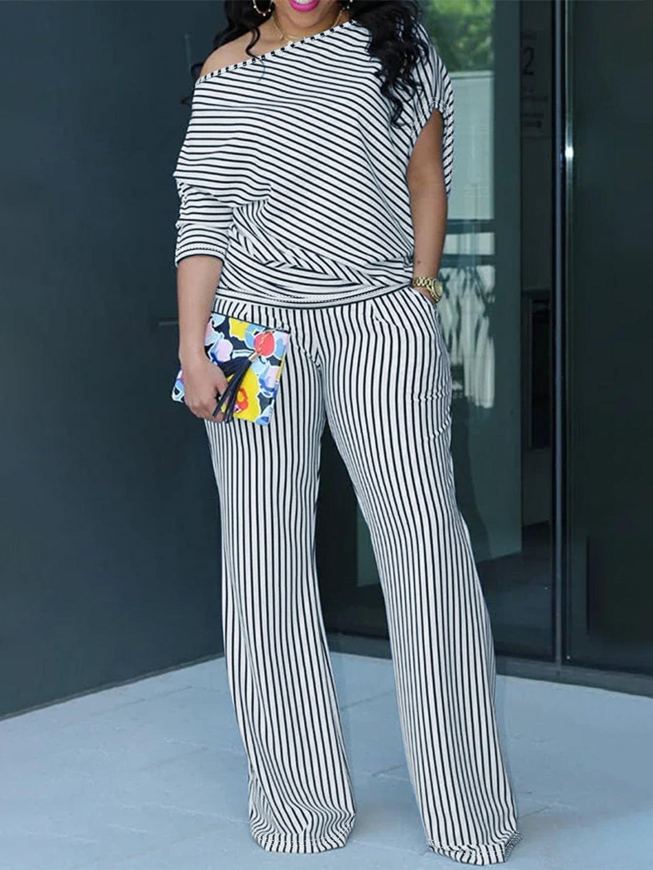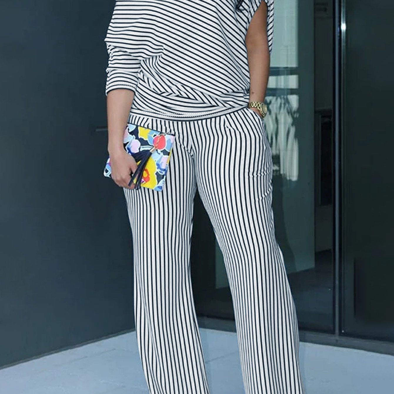 Striped Asymmetrical Neck Top & Matching Pants Set – Chic Two-Piece Outfit