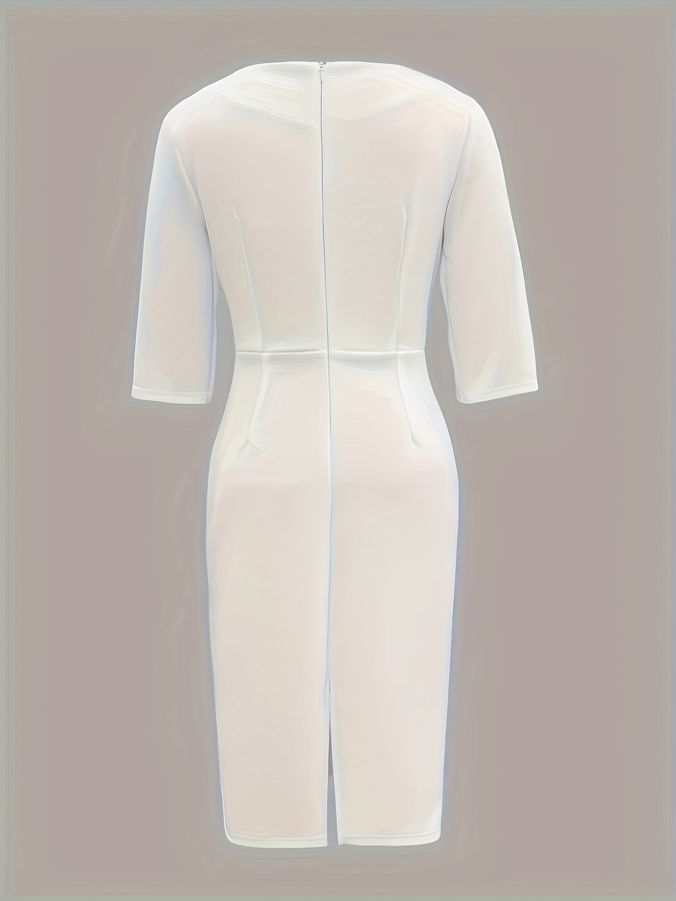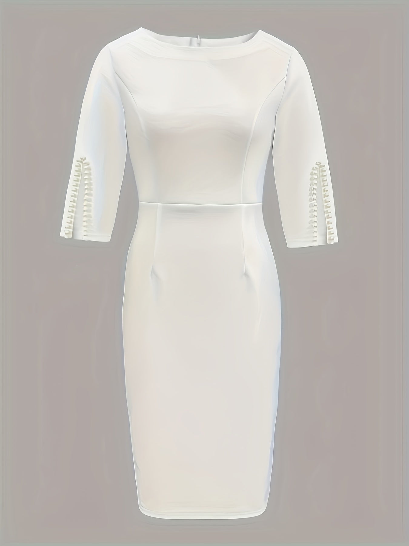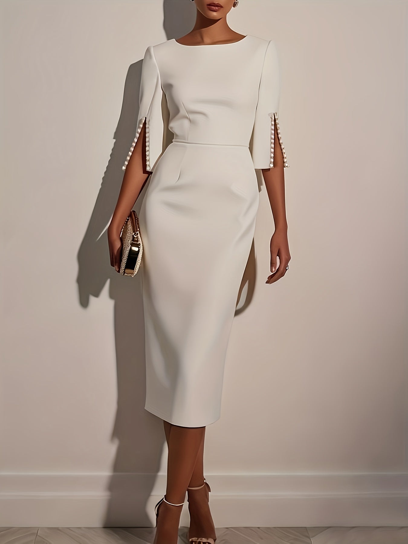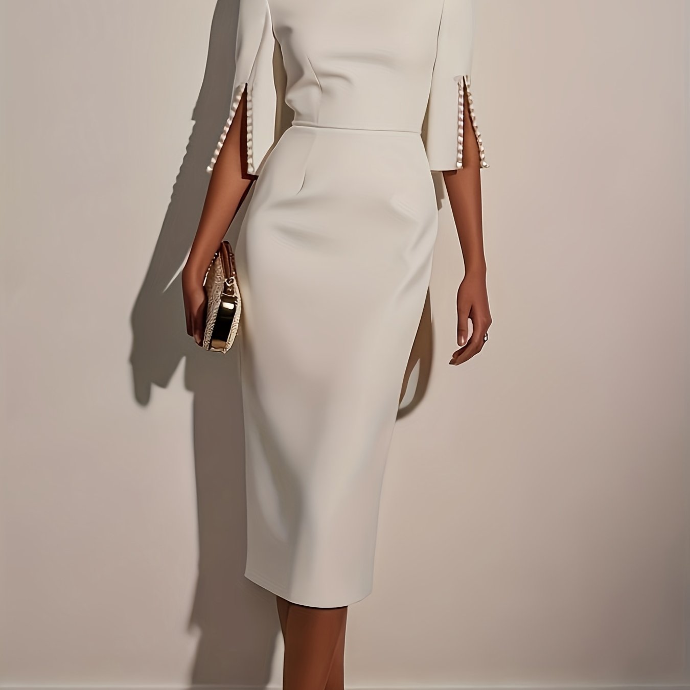 White Pearl Accented Evening Dress – Elegant Half-Sleeve Cocktail & Formal Dress